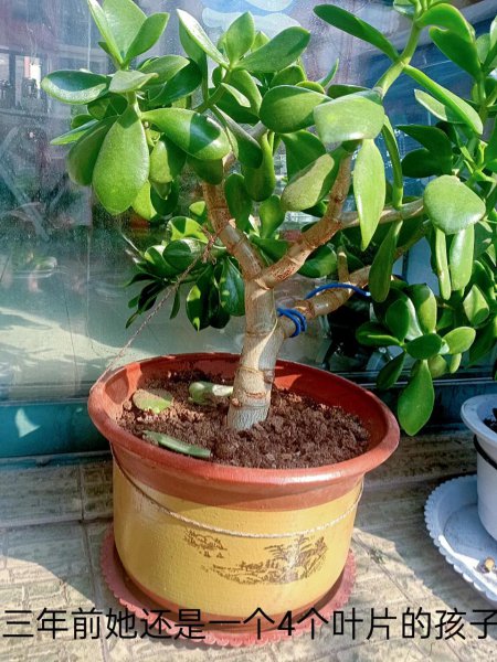 到了今年春季又刚换了一次盆,盆土用的是纯腐叶土加羊粪(过年回老家爬山在路边扫的)。同样是开水浇透杀菌。为啥要用开水呢?因为没有什么杀菌杀虫药,所以用笨方法。这是3年来第一次给玉树施肥。
