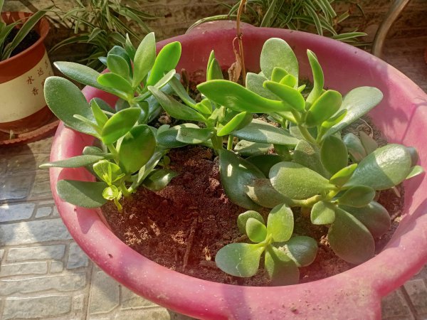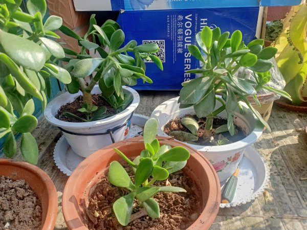 移栽到盆里不到一年的时间,玉树就长大了许多许多,小盆已经承受不住他发福的身体了,这种情况只有换大盆了。盆土用有花生壳碎的土加了点沙子,土中也有虫子,这次是用开水浇透盆土烫死害虫。同时把多余的枝条修剪了一部分插到空盆里。修剪的都是主枝下的弱枝,这些枝条留着也没啥用。还吸取主枝的营养。