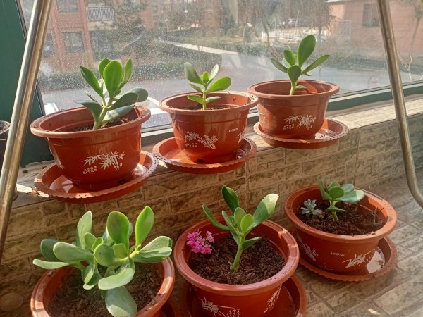 养玉树简单又省心。只要是隔5-6天浇一次水基本都不会死掉。3年前初冬刮大风在路边捡到有4片叶子的段枝。捡回家后随手插在花盆里。一个多月后发现已经成功发出了新的叶子。