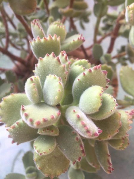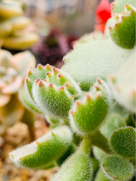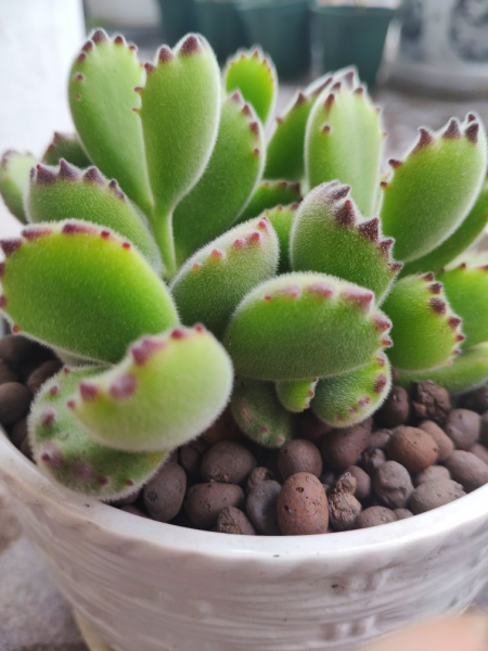 熊童子要是出状态了,熊爪子的边缘会变成大红色的,看起来更像是熊爪子了,十分可爱。咱们现在养护熊童子可以在南阳台全日照养护,但是到了夏天的时候一定要将熊童子遮遮阴,不然很容易导致叶子被灼伤。