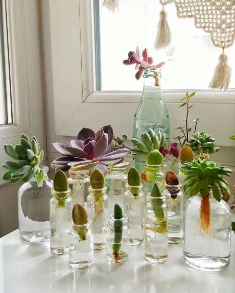 多肉植物的枝条也可以扦插在水中,能更快地长出根系,就是将枝条底部大概两三厘米左右浸泡在水里,每隔两天换水一次,放在通风透光的窗台边,要注意,水培之前也要先晾干伤口。