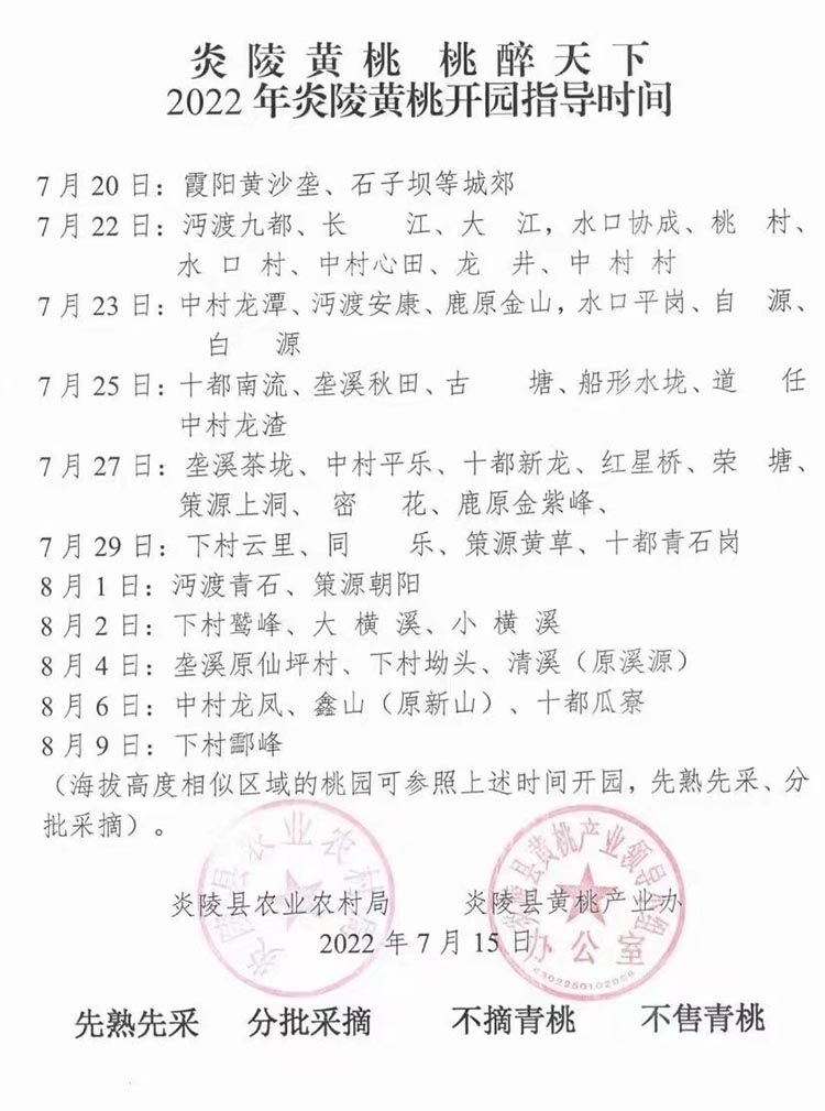 (海拔高度相似区域的桃园可参照上述时间开园,先熟先采、分批采摘)。