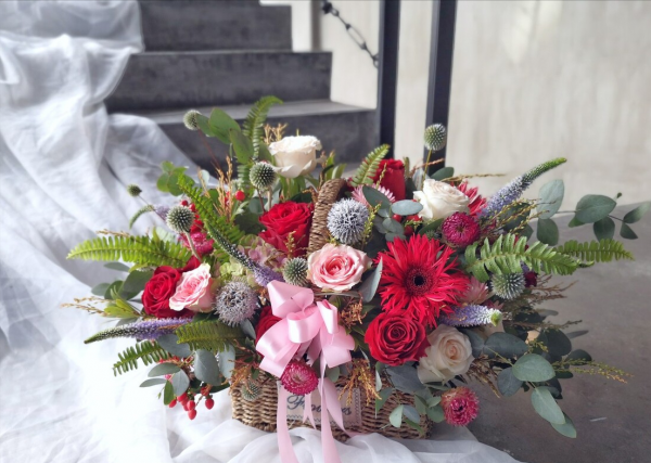 7.手提开业花篮:开业花篮也可以是很精致小巧优雅的,送给朋友的开业礼,可以摆放在前台、休闲桌的位置,也是很不错的装饰。