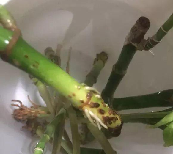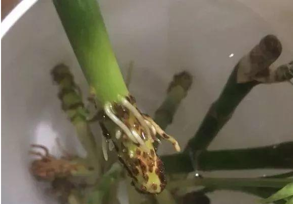 用水培养的富贵竹,如果它插入水里的杆上还留有叶片的话,那么这样的可能也不会生根,那是因为叶片会阻止它的根系从杆上冒出来。遇到这样的情况,就需要把它插入水里的那些杆上的长的叶片全部的都摘除干净,这样光溜溜的才容易更快的生根。