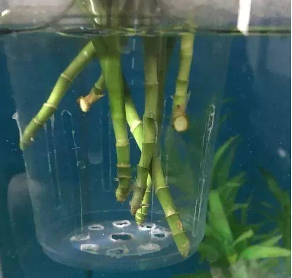 找上一个一次性的塑料杯子,并且在底部多扎上一些小的孔洞。再把扎好洞眼的杯子夹在我们家养的热带鱼的水缸的玻璃壁上,让杯子的下面大部分进入到水里。然后我们把买回来的富贵竹直接放进塑料杯里就可以了。因为我们鱼缸里的水温度一般都在25度左右,而且水一直在循环,氧气也非常的充足,还比较的干净,因此也是富贵竹特别喜欢的一个环境,放在那里它就特别容易的生根。这样坚持个3~4天,富贵竹它的根部就能长出一厘米左右的根系了。等到根部这种白绒绒的根系长到3~5厘米的时候,我们就可以把它拿出来,放入水瓶或者是放进土里面进行养殖。
