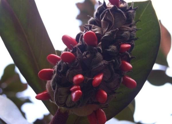 白玉兰聚合果圆柱形,青绿色,成熟时转红褐色,长12-15厘米,径3-5厘米,巨者有时长达25厘米,重达250克;蓇葖木质,褐色,具白色皮孔,通常部分心皮不育而弯曲,栽培种常都不育;单果成熟时有柔丝下垂,红果弱丝,迎风摇曳,为时不长即落;种子心脏形或不规则多面体形,长约9毫米,宽约6毫米,种皮从外到内可以分为三层,最外为革质层,呈鲜红色或粉红色,极为光滑,通常称为假种皮。中间层肉质,乳白色,手触有油腻感,最内层为一坚硬内种皮,未成熟时黄褐色,过熟时则为深黑色,有光泽。红色的外种皮和含油肉质的中种皮都是为了吸引昆虫与鸟类啄食,以利于种子的散布和萌发,坚硬的内种皮可以保护幼小的生命在萌动前免遭伤害。白玉兰种子其内种皮的合点区有一特殊结构,即由内种皮向内凹陷形成一个简单的珠孔,此结构是木兰种树种与其他科种子区别的重要特征。然而,木兰属各种子的形状大都大同小异,形似而质非,即使同一种白玉兰,产地不同,树龄差异,其种子的形状与色质也不尽雷同。