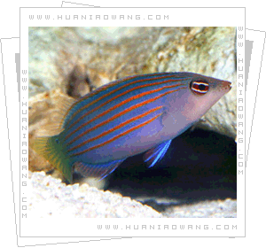 体形特征 可达10(厘米)。此鱼橘色的身上有6条蓝纵线,平日在浅海区觅食。