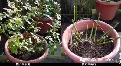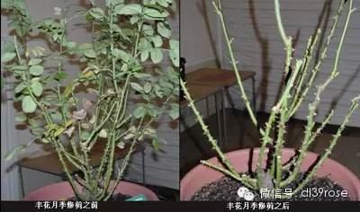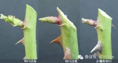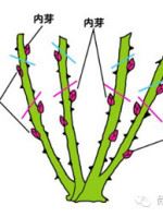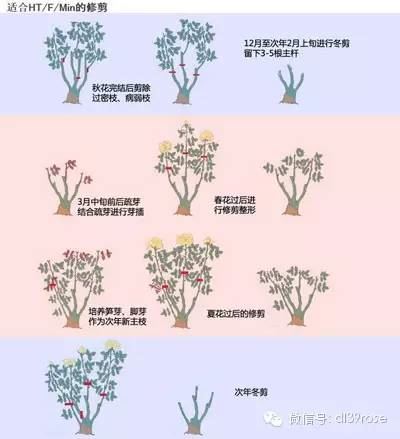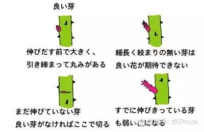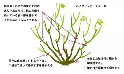 修剪的强度为品种和植株成长的速度所左右。一般剪后剪口下的3芽会成为开花枝右边文字(从上到下):