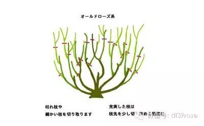 上部:老月季系。左下:剪去细枝和枯枝右下:强壮的枝条稍稍剪去尖端即可(尖端过细的部分枝条、花后分枝较多的枝条顶部)。