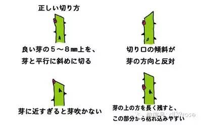 左上:正确的剪法,在选好的壮芽上部5~8mm处,与芽点平行斜剪。左下:过于靠近芽点修剪的话芽不会萌发右上:修剪的斜口和芽点朝向相反。右下:芽点上部保留过长,容易从上往下黑枝。