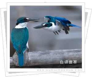描述:中等体型(24厘米)的蓝白色翡翠鸟。头顶、两翼、背及尾呈亮丽蓝绿色;过眼线黑色;嘴上部具白点。以白色的颈环及下体为识别特征。