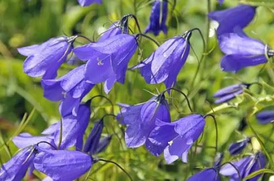 风铃草的花朵较小,聚生成总状花序,花冠为钟形,有白色、紫色、蓝色三种花色,且植株里面都含有很多较为光滑的椭圆形种子,产于南欧等北温带到亚寒带地区,栽培在中国各地。