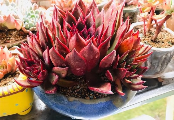 这种多肉的叶片硬朗厚实,看上去霸气十足,真的是很特别的,并且还容易长出新芽,非常容易爆盆。建议多晒晒太阳,可以更好的进行光合作用,叶片也会更好看,红彤彤的,光泽感十足,美极了。