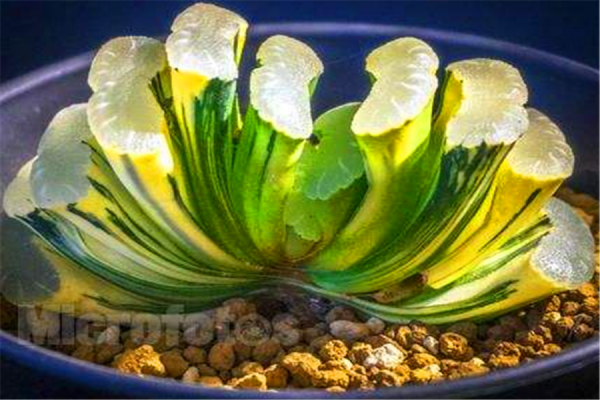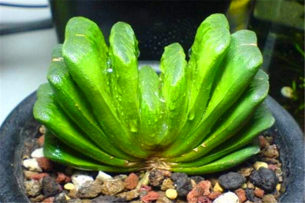 玉扇非常喜欢湿润的空气环境,当空气湿度较大的时候,玉扇的叶片会吸收足够的水分,变得更加饱满透亮,这是玉扇出状态的一个关键点。看到这里很多经常养多肉的花友就会想起另一种美丽的多肉,那就是玉露。它和玉扇同样喜欢湿润的空气,在湿润的环境里才能变得饱满透亮,所以玉扇和玉露一样都可以用焖养的方式让他们出状态。