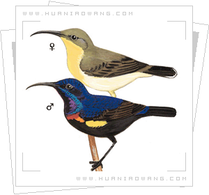 描述:体小(11厘米)而色甚深的花蜜鸟。雄鸟在多数光线下显全黑,但具绿色闪辉和绛紫色的胸带,胸侧羽簇可能为黄色及橘黄色。雌鸟上体橄榄色,下体暗黄。与雌黄腹花蜜鸟的区别在下体色较淡,尾端白色较窄。繁殖后的雄鸟似雌鸟,但喉中心具黑色纵纹,与雄黄腹花蜜鸟的区别在翼覆羽为虹闪蓝色。