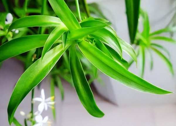 吊兰是一种观叶观花植物,其叶片细长柔软,呈带状或披针形,边缘有白色或黄色的条纹。吊兰的花朵很小,呈白色或淡黄色,开在细长的花茎上。吊兰还会长出许多小苗,在空中垂下来,形成一束束的“小吊兰”,非常可爱。