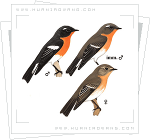 体形特征 雄鸟:体型略小(13厘米)的橘黄及黑白色的鹟。上体灰黑,狭窄的白色眉纹于眼后;翼上具明显的白斑,尾基部羽缘白色;喉、胸及腹侧橘黄;腹中心及尾下覆羽白色。雌鸟:上体包括腰褐色,下体似雄鸟但色淡,尾无白色。亚成鸟:上体全褐,下体及翼纹皮黄,腹白。虹膜-深褐;嘴-暗角质色;脚-深褐。