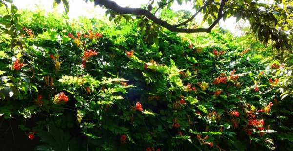 凌霄花入夏后枝繁叶茂,朵朵红花缀于绿叶中次第开放,十分美丽,枝条下垂,藤蔓斜飘,宛如一个戴着绚丽盖头的女子,楚楚动人,美不可言!