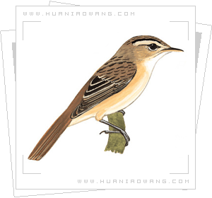 描述:中等体型(13厘米)的苇莺。上体赭褐,顶冠及上背具模糊的纵纹。下体皮黄,喉偏白。脸颊近黄,眉纹皮黄而上具黑色的宽纹。比黑眉苇莺上体色淡且纵纹较多,嘴显粗而长。