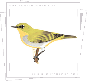 描述:体小(11厘米)的橄榄绿色绣眼鸟。似暗绿绣眼鸟,但区别为沿腹中心向下具一道狭窄的柠檬黄色斑纹,眼先及眼区黑色,白色的眼圈较窄。