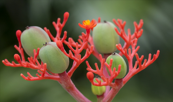 佛肚海棠,几乎全年都在长叶子,只要生长就能正常开花,密集细小的红花,犹如一支支红珊瑚一样,非常美丽;更为奇特的是,它的花果同存,互相争奇斗艳,十分有趣。