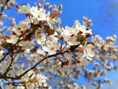 紫叶李,四五月开花,花期一月,白花满树,满树紫叶,新花新叶,相互衬托,别有一番风味;花小托圆,时而外卷,白中含粉,缀满枝头,如云蒸似霞蔚,颇有几分气势,观花则心动难耐。