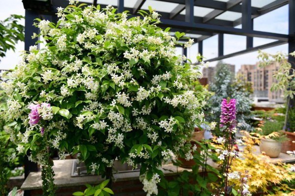 其次推荐的植物是风车茉莉。风中茉莉是一种非常皮实的植物,它有很好的延展性。无论是天寒地冻,还是高温高热,它都能适应。在开花的时候风车一般的白色花朵布满了整个枝头。
