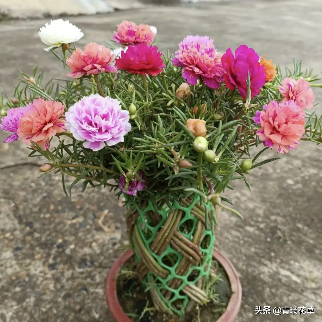 复瓣的太阳花很像一个个微型的牡丹花,所以,这种太阳花老桩相当于一株株微型牡丹,比自然播种生出的太阳花更具观赏性。当然了,虽说老桩太阳花更好看,但也别在保温上大意,毕竟是一种怕冷植物。所以入秋后就注意及时入室保温吧,在入室后借着这一段衰花期顺便给它们修剪修剪、补充下肥料,只要气温适宜,它们甚至依旧可以在冬天开放的,花友们快去试试吧。