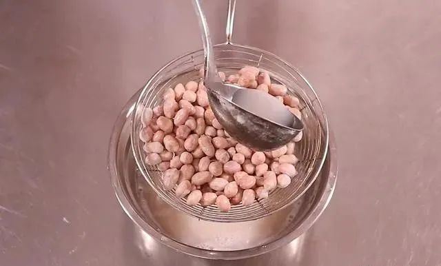 4. 花生米放在笊篱中,用勺子舀起糖浆浇在花生米上,所有花生米都要浇湿;