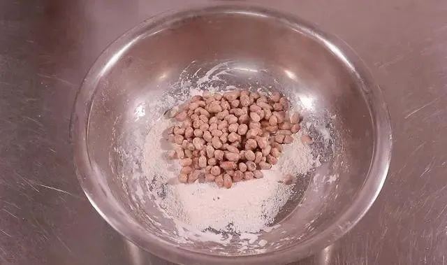5. 把湿的花生米倒在铺了混合粉的大盆里;