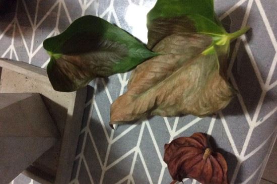 红掌喜光,但只适合散射光,忌强光照耀,叶子枯萎可能是光照太强导致的。适宜的生长温度在20~28℃,养护时遇到高温天气叶子容易发黄,变得像烧焦了一样,需要及时转移到阴凉处进行遮阴,并保持通风,洒水降温,过一段时间就会恢复翠绿。
