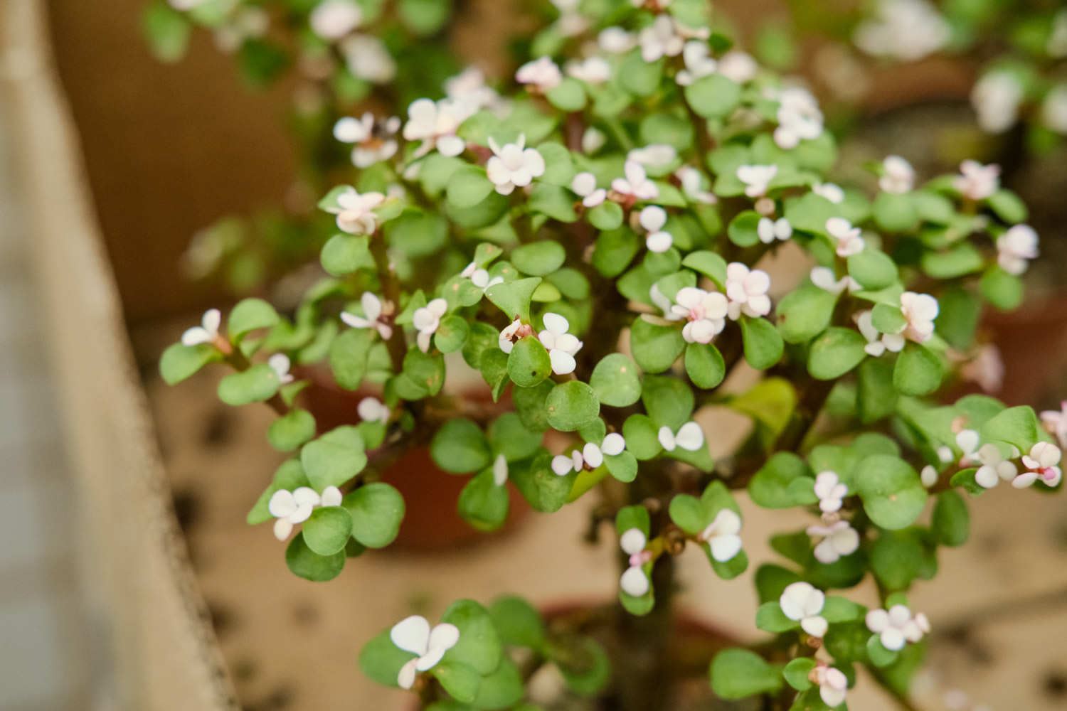 金枝玉叶是观赏性很高的植物,平时可以将它放在庭院、室内、阳台或书房等地。它的叶子翠绿且很有光泽,茎也是绿色的,并且它还会开出淡粉色的花朵,十分美丽。