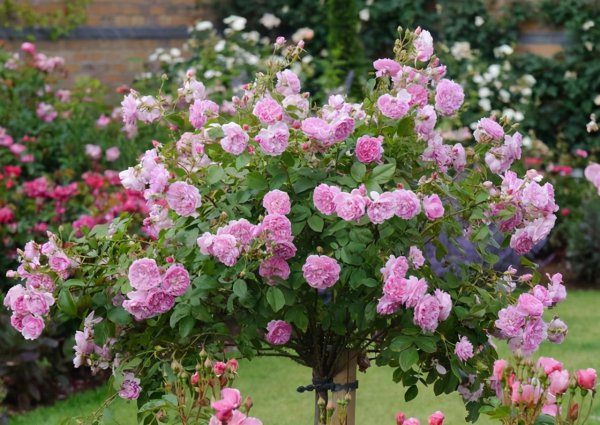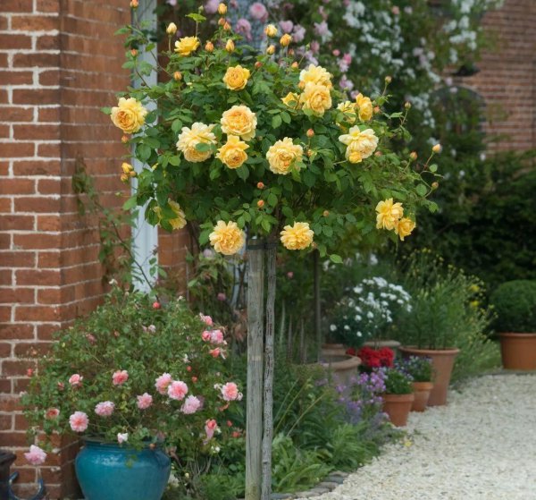 c:生性更强健,根系更发达,因为树形月季的树干取自蔷薇,所以根系发达,生命力极强,特别是种植月季偏南的土壤碱性高的地区,种植树形月季就能长得很好。