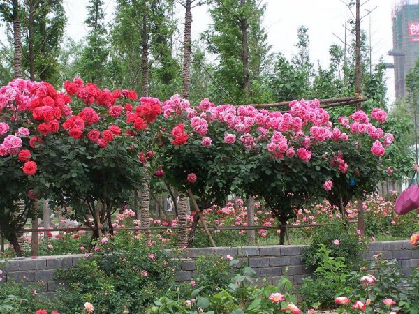 月季树是用粗壮的蔷薇做树干,然后在月季中选择直立性好,易发分枝、开花性好、冠株匀称的品种,进行嫁接,然后通过修剪、整形等养护措施,培出来的一种新的月季口种,是当年世界上最新的月季口种,也是园艺界最新的技术。