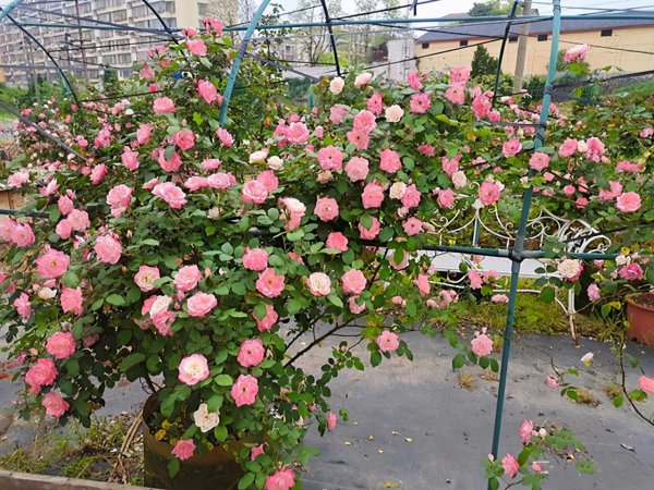 这个月季可能很多人没有听过,我是去年入手的,一棵牙签苗,不大,带有花苞,当时把花苞剪掉了,一年只让它长枝条了,没有让它开花,结果很快就长出了两个笋芽,今年已经爬出一大片,每个新长出的枝条上都有花苞,看来开花性也不错,花色是娇艳的粉色,有点仙气飘飘的感觉,耐寒性特别好,非常勤花,有浓郁的花香,唯一的缺点,就是它的夏花在高温时易散,枝条柔软,而花朵很大花瓣很多,所以易垂头,单次花期短,不到一周,是一种小型藤本,可盆栽可地栽,我感觉还是值得养的。