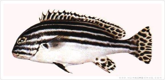 体形特征 银色身体带四条深褐色垂直条纹,各鳍及嘴部带淡黄色,一些黑点分布在鳍上。