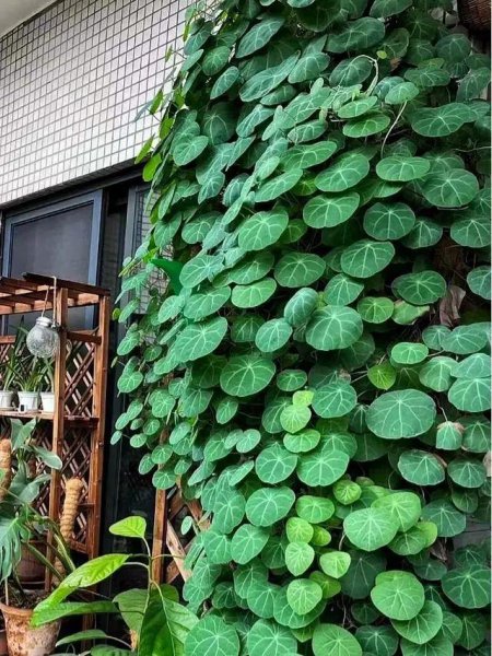 山乌龟属于爬藤植物,很多品种的藤蔓可以长得非常茂密。上图是四川一位花友养的山乌龟,不到一年的时间就爬满了一面墙。山乌龟的叶片非常圆润,叶面上有银白色的叶脉,有点像荷花叶片。相比于绿萝、吊兰这些传统的家庭绿植品种,山乌龟更容易养护。