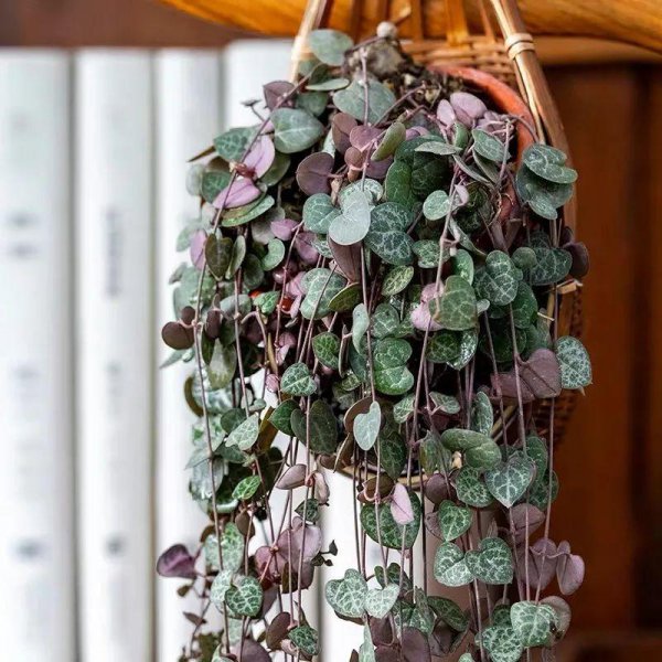 爱之蔓又叫心心相印、可爱藤、吊灯花,为萝藦科吊灯花属多年生肉质变形草本植物,属于多肉植物的一种。花如其名,爱之蔓的叶片是独特的心形,可以说每一片叶子都是“爱你”的形状。叶片表面带有花纹,绿中透粉,枝蔓细长但都比较短,属于小型藤本,适合用小花盆垂吊养护。悬挂起来的爱之蔓,枝条纷纷垂下,姿态轻盈,潇洒飘逸。