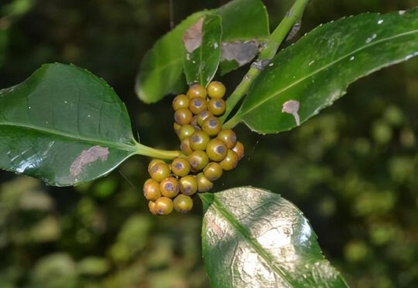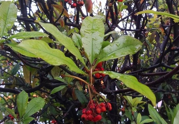 铁冬青,别名救必应、熊胆木、白银香、白银木、过山风、红熊胆、羊不食、七星香、万紫千红等,为冬青科亚热带常绿灌木或乔木,高可达20米,胸径达1米。花小,黄白色,芳香;雌雄异株,果球形,6-8mm大小,熟时红色;花期3一4月,果熟期10-12月。