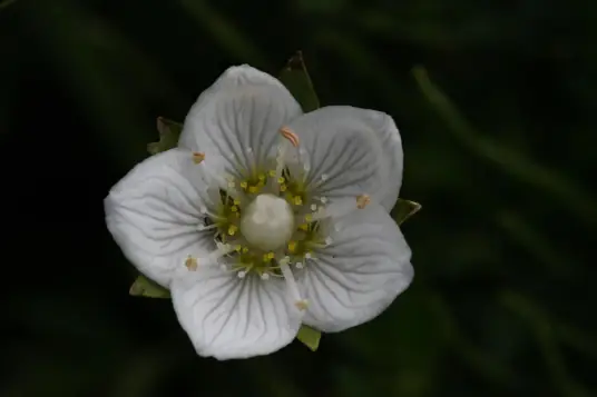 梅花草(Parnassia palustris L.),是卫矛科梅花草属的多年生草本植物。梅花草茎生叶与基生叶同形,基部常有铁锈色附属物;叶基生,卵形或长卵形、稀三角状卵形 ,常被紫色长圆形斑点;花单生茎顶,萼片椭圆形或长圆形,密被紫褐色小斑点,花瓣白色,宽卵形或倒卵形;蒴果卵圆形,干后有紫褐色斑点;花期7-9月;果期10月; 梅花草因秋季开白色或淡黄色大花,形如梅花,故名。
