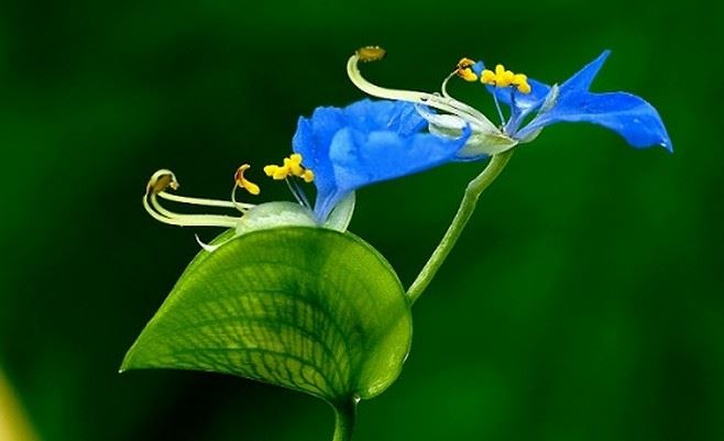一年生披散草本。茎匍匐生根,多分枝,长可达1米,下部无毛,上部被短毛。叶披针形至卵状披针形,长3-9厘米,宽1.5-2厘米。总苞片佛焰苞状,有1.5-4厘米的柄,与叶对生,折叠状,展开后为心形,顶端短急尖,基部心形,长1.2-2.5厘米,边缘常有硬毛;聚伞花序,下面一枝仅有花1朵,具长8毫米的梗,不孕;上面一枝具花3-4朵,具短梗,几乎不伸出佛焰苞。花梗长仅3毫米,果期弯曲,长不过6毫米;萼片膜质,长约5毫米,内面2枚常靠近或合生;花瓣深蓝色;内面2枚具爪,长近1厘米。蒴果椭圆形,长5-7毫米,2室,2爿裂,有种子4颗。种子长2-3毫米,棕黄色,一端平截、腹面平,有不规则窝孔。